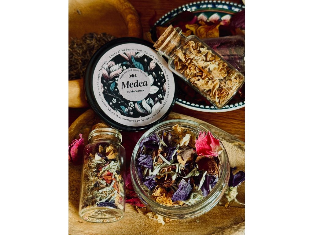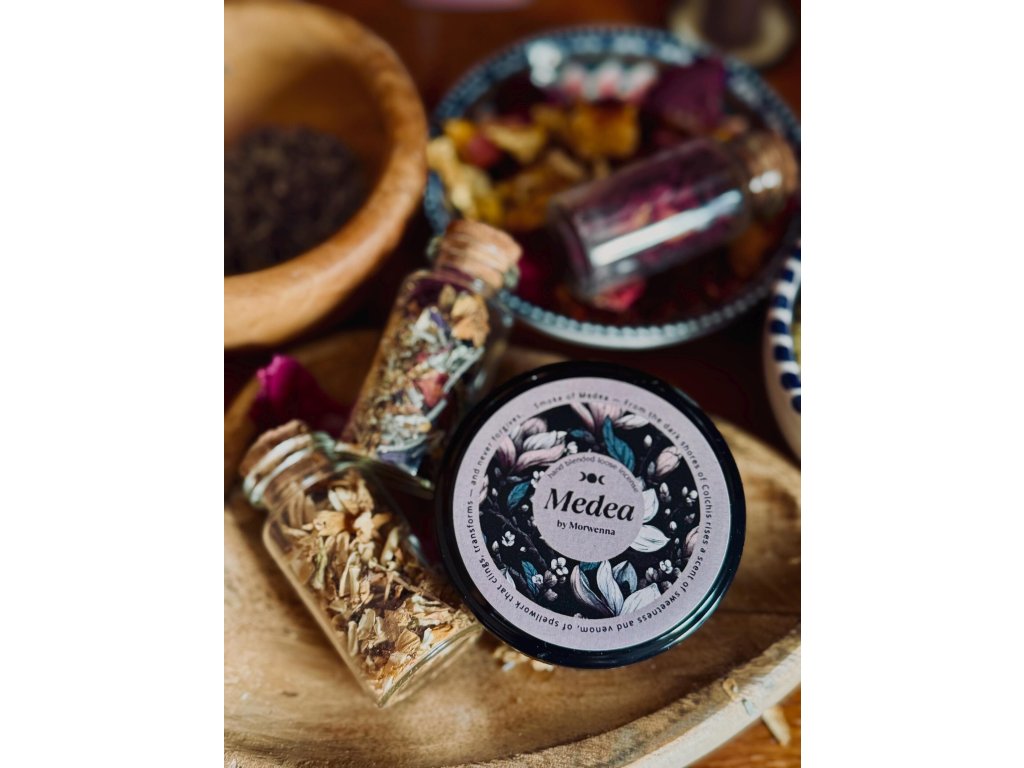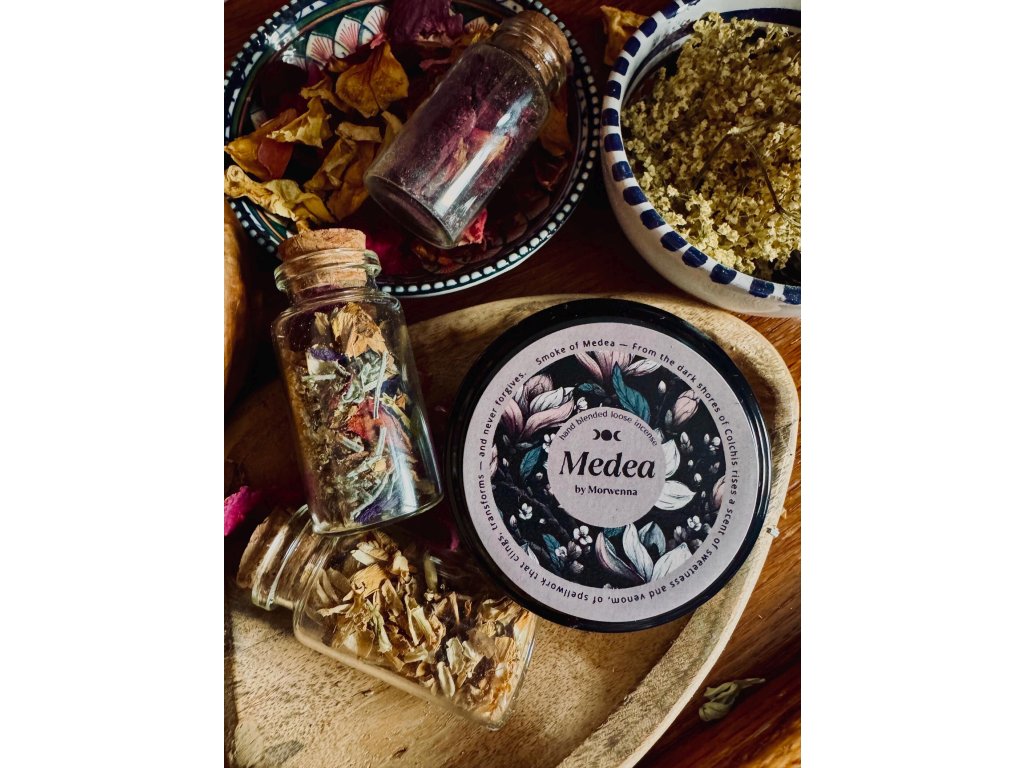 Tato okouzlující směs vonných tyčinek je poctou jedné z nejmocnějších čarodějnic starověkých mýtů. Médea, čarodějnice z Kolchidy, byla mistryní tajemství – ženou, která vroucně milovala a stejně hluboce nenáviděla. Její magie čerpala sílu z posvátných bylin, lunárních rituálů a divokých, starodávných sil přírody, vedených bohyní Hekaté.